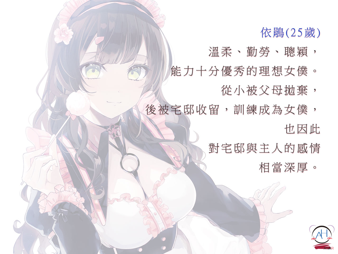 溫柔、勤勞、聰穎,能力十分優秀的理想女僕。從小被父母拋棄,後被宅邸收留,訓練成為女僕,也因此對宅邸與主人的感情相當深厚。
